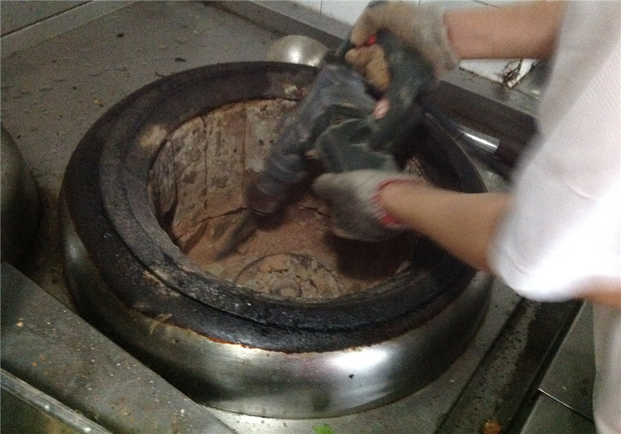 我处工作人员正在对一个饭店的炒炉进行炉头更换